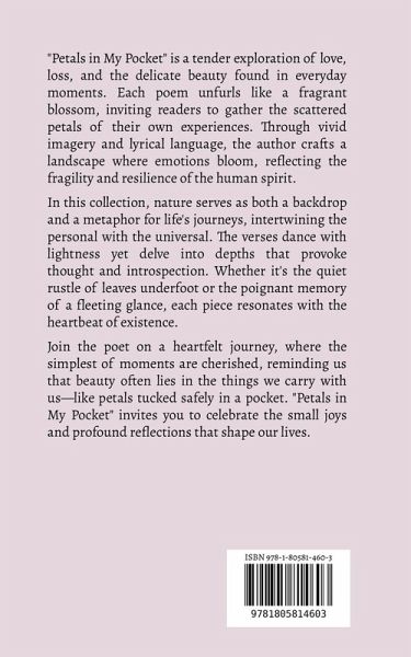 "Petals in My Pocket" is a tender exploration of love, loss, and the delicate beauty found in everyday moments. Each poem unfurls like a fragrant blossom, inviting readers to gather the scattered petals of their own experiences. Through vivid imagery and lyrical language, the author crafts a landscape where emotions bloom, reflecting the fragility and resilience of the human spirit. In this collection, nature serves as both a backdrop and a metaphor for life's journeys, intertwining the personal with the universal. The verses dance with lightness yet delve into depths that provoke thought and introspection. Whether it's the quiet rustle of leaves underfoot or the poignant memory of a fleeting glance, each piece resonates with the heartbeat of existence. Join the poet on a heartfelt journey, where the simplest of moments are cherished, reminding us that beauty often lies in the things we carry with us-like petals tucked safely in a pocket. "Petals in My Pocket" invites you to celebrate the small joys and profound reflections that shape our lives.