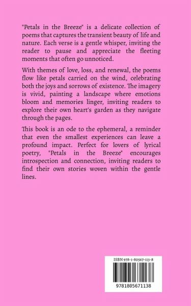 "Petals in the Breeze" is a delicate collection of poems that captures the transient beauty of life and nature. Each verse is a gentle whisper, inviting the reader to pause and appreciate the fleeting moments that often go unnoticed. With themes of love, loss, and renewal, the poems flow like petals carried on the wind, celebrating both the joys and sorrows of existence. The imagery is vivid, painting a landscape where emotions bloom and memories linger, inviting readers to explore their own heart's garden as they navigate through the pages. This book is an ode to the ephemeral, a reminder that even the smallest experiences can leave a profound impact. Perfect for lovers of lyrical poetry, "Petals in the Breeze" encourages introspection and connection, inviting readers to find their own stories woven within the gentle lines.