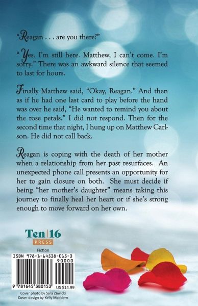 "Reagan . . . are you there?" "Yes. I'm still here. Matthew, I can't come. I'm sorry." There was an awkward silence that seemed to last for hours. Finally Matthew said, "Okay, Reagan." And then as if he had one last card to play before the hand was over, he said, "He wanted to remind you about the rose petals." I did not respond. Then for the second time that night, I hung up on Matthew Carlson. He did not call back. Reagan is coping with the death of her mother when a relationship from her past resurfaces. An unexpected phone call presents an opportunity for her to gain closure on both. She must decide if being "her mother's daughter" means taking this journey to finally heal her heart or if she's strong enough to move forward on her own.