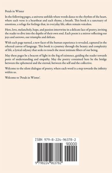 Petals in Winter In the following pages, a universe unfolds where words dance to the rhythm of the heart, where each verse is a heartbeat and each rhyme, a breath. This book is a sanctuary of emotions, a refuge for feelings that, in everyday life, often remain voiceless. Here, love, melancholy, hope, and passion intertwine in a delicate lace of poetry, inviting the reader to dive into the depths of their own soul. Each poem is a mirror reflecting our joys and sorrows, our triumphs and defeats. With each page turned, a new facet of the human experience is revealed, captured in the ethereal canvas of language. This book is a journey through the beauty and complexity of life, a lyrical odyssey that seeks to touch the most intimate fibers of our being. May these pages be a beacon of light in the fog of existence, guiding the reader towards ports of understanding and empathy. May the poetry contained here be the bridge between the ephemeral and the eternal, between the self and the collective. Welcome to the silent dialogue of poetry, where each word is a step towards the infinity within us. Welcome to 'Petals in Winter'.