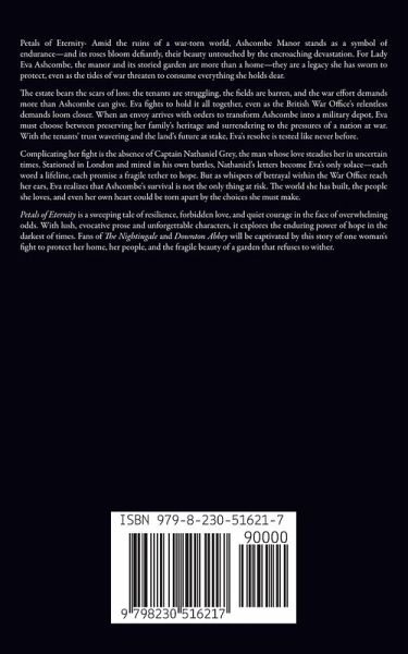 Petals of Eternity- Amid the ruins of a war-torn world, Ashcombe Manor stands as a symbol of endurance-and its roses bloom defiantly, their beauty untouched by the encroaching devastation. For Lady Eva Ashcombe, the manor and its storied garden are more than a home-they are a legacy she has sworn to protect, even as the tides of war threaten to consume everything she holds dear. The estate bears the scars of loss: the tenants are struggling, the fields are barren, and the war effort demands more than Ashcombe can give. Eva fights to hold it all together, even as the British War Office's relentless demands loom closer. When an envoy arrives with orders to transform Ashcombe into a military depot, Eva must choose between preserving her family's heritage and surrendering to the pressures of a nation at war. With the tenants' trust wavering and the land's future at stake, Eva's resolve is tested like never before. Complicating her fight is the absence of Captain Nathaniel Grey, the man whose love steadies her in uncertain times. Stationed in London and mired in his own battles, Nathaniel's letters become Eva's only solace-each word a lifeline, each promise a fragile tether to hope. But as whispers of betrayal within the War Office reach her ears, Eva realizes that Ashcombe's survival is not the only thing at risk. The world she has built, the people she loves, and even her own heart could be torn apart by the choices she must make. Petals of Eternity is a sweeping tale of resilience, forbidden love, and quiet courage in the face of overwhelming odds. With lush, evocative prose and unforgettable characters, it explores the enduring power of hope in the darkest of times. Fans of The Nightingale and Downton Abbey will be captivated by this story of one woman's fight to protect her home, her people, and the fragile beauty of a garden that refuses to wither.