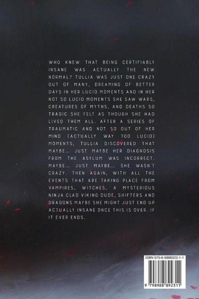 Who knew that being certifiably insane was actually the new normal? Tullia was just one crazy out of many, dreaming of better days in her lucid moments and in her not so lucid moments she saw wars, creatures of myths, and deaths so tragic she felt as though she had lived them all. After a series of traumatic and not so out of her mind (actually way too lucid) moments, Tullia discovered that maybe...just maybe her diagnosis from the asylum was incorrect. Maybe...just maybe...she wasn't crazy. Then again, with all the events that are taking place from vampires, witches, a mysterious ninja clad Viking dude, shifters and dragons maybe she might just end up actually insane once this is over. If it ever ends.