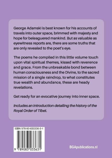 George Adamski is best known for his accounts of travels into outer space, brimmed with majesty and hope for beleaguered mankind. But as valuable as eyewitness reports are, there are some truths that are only revealed to the poet's eye. Originally published in 1937, the poems he compiled in this little volume touch upon vital spiritual themes, kissed with reverence and grace. From the unbreakable bond between human consciousness and the Divine, to the sacred mission of a single raindrop, to what constitutes true wealth and abundance, these are heady revelations. Get ready for an evocative journey within. Includes an introduction detailing the history of George Adamski's Royal Order of Tibet.