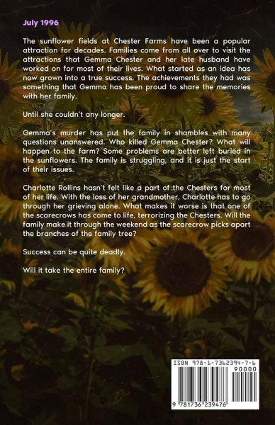 July 1996 The sunflower fields at Chester Farms have been a popular attraction for decades. Families come from all over to visit the attractions that Gemma Chester and her late husband have worked on for most of their lives. What started as an idea has now grown into a true success. The achievements they had was something that Gemma has been proud to share the memories with her family. Until she couldn't any longer. Gemma's murder has put the family in shambles with many questions unanswered. Who killed Gemma Chester? What will happen to the farm? Some problems are better left buried in the sunflowers. The family is struggling, and it is just the start of their issues. Charlotte Rollins hasn't felt like a part of the Chesters for most of her life. With the loss of her grandmother, Charlotte has to go through her grieving alone. What makes it worse is that one of the scarecrows has come to life, terrorizing the Chesters. Will the family make it through the weekend as the scarecrow picks apart the branches of the family tree? Success can be quite deadly. Will it take the entire family?