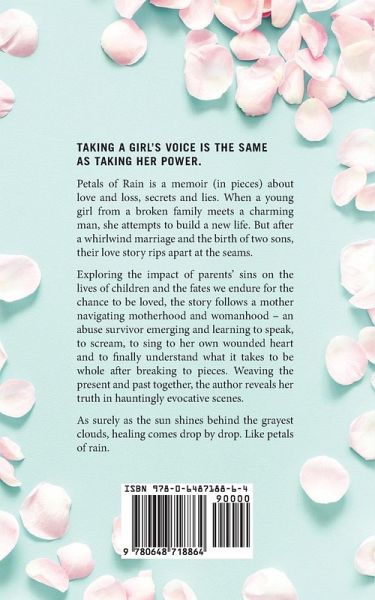 Taking a girl's voice is the same as taking her power. This is a memoir about love and loss, secrets and lies. When a young girl from a broken family meets a charming man, she attempts to build a new life. But after a whirlwind marriage and the birth of two sons, their love story rips apart at the seams. Exploring the impact of parents' sins on the lives of children and the fates we endure for the chance to be loved, the story follows a mother navigating motherhood and womanhood - an abuse survivor emerging and learning to speak, to scream, to sing to her own wounded heart and to finally understand what it takes to be whole after breaking to pieces. Weaving the present and past together, the author reveals her truth in hauntingly evocative scenes. As surely as the sun shines behind the grayest clouds, healing comes drop by drop. Like petals of rain.