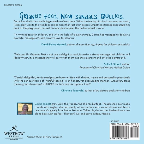 Gigantic feet. New sandals. Bullies. Pete's feet don't stink, but being made fun of sure does. When the teasing at school becomes too much, Pete's daily visit to the woods becomes more than just a fun detour. Empathetic friends encourage him back to the playground, but will his new plan to quiet the bullies actually work? "In rhyming text for children, and with the help of clever animals, Carrie has managed to deliver a powerful message of God's creative love for all of us." Dandi Daley Mackall, author of more than 450 books for children and adults "Pete and His Gigantic Feet is not only a delight to read, it carries a strong message that children will identify with. It's a message they will carry with them into the classroom and onto the playground." Sally E. Stuart, author Founder of Christian Writers Market Guide "Carrie's delightful, fun-to-read picture book--written with rhythm, rhyme and personality plus--deals with the serious theme of "hurtful teasing" in an honest, yet encouraging manner. Great fun, great theme, great characters! HOORAY for Pete and his Gigantic Feet!" Christine Tangvald, author of 90 picture books for children