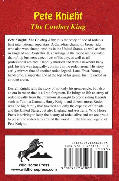 Pete Knight: The Cowboy King tells the story of one of rodeo's first international superstars. A Canadian champion bronc rider who also won championships in the United States, as well as fans in England and Australia. His earnings in the rodeo arena rivaled that of top business executives of his day, as well as all professional athletes. Happily married and with a newborn baby girl, his life was tragically cut short in the rodeo arena. His story eerily mirrors that of another rodeo legend, Lane Frost. Young, handsome, a superstar and at the top of his game, his life ended in a rodeo arena.