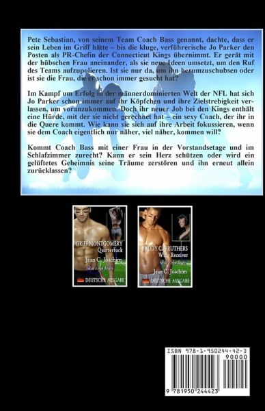 Pete Sebastian, von seinem Team Coach Bass genannt, dachte, dass er sein Leben im Griff hätte – bis die kluge, verführerische Jo Parker den Posten als PR-Chefin der Connecticut Kings übernimmt. Er gerät mit der hübschen Frau aneinander, als sie neue Ideen umsetzt, um den Ruf des Teams aufzupolieren. Ist sie nur da, um ihn herumzuschubsen oder ist sie die Frau, die er schon immer gesucht hat? Im Kampf um Erfolg in der männerdominierten Welt der NFL hat sich Jo Parker schon immer auf ihr Köpfchen und ihre Zielstrebigkeit verlassen, um voranzukommen. Doch ihr neuer Job bei den Kings enthält eine Hürde, mit der sie nicht gerechnet hat – ein sexy Coach, der ihr in die Quere kommt. Wie kann sie sich auf ihre Arbeit fokussieren, wenn sie dem Coach eigentlich nur näher, viel näher, kommen will? Kommt Coach Bass mit einer Frau in der Vorstandsetage und im Schlafzimmer zurecht? Kann er sein Herz schützen oder wird ein gelüftetes Geheimnis seine Träume zerstören und ihn erneut allein zurücklassen? ACHTUNG: Dieses Buch enthält derbe Sprache.