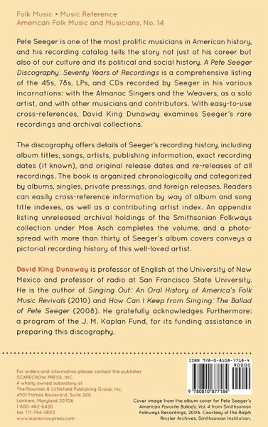 Pete Seeger is one of the most recorded artists in American history, and his recording catalog tells us not just the story of his career but the story of our culture and its political and social history. A Pete Seeger Discography: Seventy Years of Recordings is a comprehensive listing of the 45s, 78s, LPs, and CDs recorded by Seeger in his various incarnations: with the Almanac Singers, with the Weavers, as a solo artist, and with other musicians and contributors. David King Dunaway provides information, with easy to use cross-references, on rare recordings and archival collections. The discography offers details on Seeger's recording history, including the album title, song(s), other artists on the recording, the publisher and number, and the year or exact recording date if known, as well as the original release date and the re-releases of each recording. Structured to make locating details easy for readers, the recordings are organized chronologically and categorized by albums, singles, private pressings, and foreign releases. Readers can easily cross-reference through album and song title indexes and a contributing artist index. An appendix listing the unreleased archival holdings of the Smithsonian Folkways collection under Moe Asch completes the volume, and a photospread with more than 30 of Seeger's album covers convey a pictorial recording history of this well-loved artist. The authors gratefully acknowledge Furthermore: a program of the J.M. Kaplan Fund, for their funding assistance in preparing this discography.