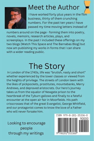 In London of the 1740s, life was "brutish, nasty and short" whether experienced by the lower classes or viewed from the heights of privilege. The streets of London teem with the likes of pickpockets, prostitutes, mountebanks, Merry Andrews, and depraved aristocrats. Our hero's journey takes us from the squalor of Newgate prison to the heartbreak of the Tyburn gallows and finally to a fateful encounter at the open air fair in Moorfields. His path crisscrosses that of the great Evangelist, George Whitfield, and our protagonist comes to know the love of a Father who will never forsake him.
