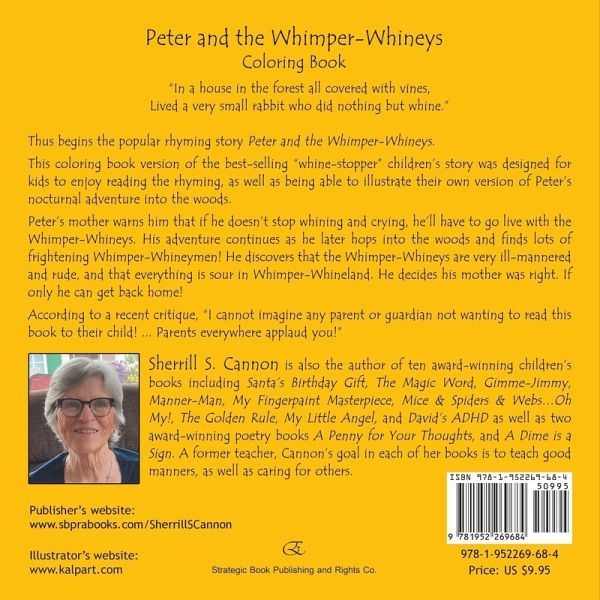 "In a house in the forest all covered with vines, Lived a very small rabbit who did nothing but whine." Thus begins the popular rhyming story Peter and the Whimper-Whineys. This coloring book version of the best-selling "whine-stopper" children's story was designed for kids to enjoy reading the rhyming, as well as being able to illustrate their own version of Peter's nocturnal adventure into the woods. Peter's mother warns him that if he doesn't stop whining and crying, he'll have to go live with the Whimper-Whineys. His adventure continues as he later hops into the woods and finds lots of frightening Whimper-Whineymen! He discovers that the Whimper-Whineys are very ill-mannered and rude, and that everything is sour in Whimper-Whineland. He decides his mother was right. If only he can get back home! According to a recent critique, "I cannot imagine any parent or guardian not wanting to read this book to their child! ... Parents everywhere applaud you!" Author Bio: Sherrill S. Cannon is also the author of ten award-winning children's books including Santa's Birthday Gift, The Magic Word, Gimme-Jimmy, Manner-Man, My Fingerpaint Masterpiece, Mice & Spiders & Webs…Oh My!, The Golden Rule, My Little Angel, and David's ADHD as well as two award-winning poetry books A Penny for Your Thoughts, and A Dime is a Sign. A former teacher, Cannon's goal in each of her books is to teach good manners, as well as caring for others.