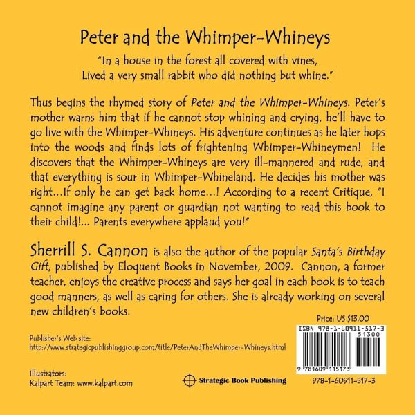 "In a house in the forest all covered with vines, Lived a very small rabbit who did nothing but whine." Thus begins the rhymed story of Peter and the Whimper-Whineys. Peter's mother warns him that if he cannot stop whining and crying, he'll have to go live with the Whimper-Whineys. His adventure continues as he later hops into the woods and finds lots of frightening Whimper-Whineymen! He discovers that the Whimper-Whineys are very ill-mannered and rude, and that everything is sour in Whimper-Whineland. He decides his mother was right...If only he can get back home...! According to a recent Critique, "I cannot imagine any parent or guardian not wanting to read this book to their child!... Parents everywhere applaud you!" Sherrill S. Cannon is also the author of the popular Santa's Birthday Gift, published by Eloquent Books in November, 2009. Cannon, a former teacher, enjoys the creative process and says her goal in each book is to teach good manners, as well as caring for others. She is already working on several new children's books. Publisher's Web site: http://www.strategicpublishinggroup.com/title/PeterAndTheWhimper-Whineys.html