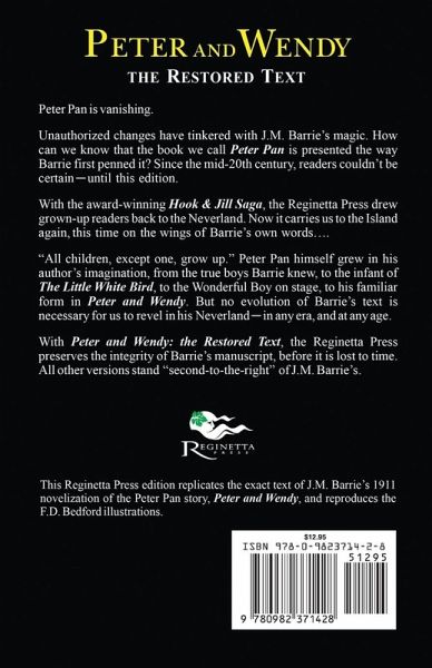 Peter Pan is vanishing. Unauthorized changes have tinkered with J.M. Barrie's magic. How can we know that the book we call "Peter Pan" is presented the way Barrie first penned it? Since the mid-20th century, readers couldn't be certain¿ until this edition. With the award-winning "Hook & Jill" Saga, the Reginetta Press drew grown-up readers back to the Neverland. Now it carries us to the Island again, this time on the wings of Barrie's own words.... "All children, except one, grow up." Peter Pan himself grew in his author's imagination, from the true boys Barrie knew, to the infant of "The Little White Bird," to the Wonderful Boy on stage, to his familiar form in "Peter and Wendy." But no evolution of Barrie's text is necessary for us to revel in his Neverland¿ in any era, and at any age. With "Peter and Wendy: The Restored Text," the Reginetta Press preserves the integrity of Barrie's manuscript, before it is lost to time. All other versions stand "second-to-the-right" of J.M. Barrie's. This Reginetta Press edition replicates the exact text of J.M. Barrie's 1911 novelization of the Peter Pan story, "Peter and Wendy," and reproduces the F.D. Bedford illustrations. With supplemental material documenting the development of J.M. Barrie's concept of Peter Pan over the years: --"The Evolution of Peter Pan," tracing the growth of the Peter Pan mythology; --Editor's supplement: "A Gift of Ghosts," revealing background and insight into the origin of Peter Pan in J.M. Barrie's personal life. --Text restored to original form, which editions since the mid-20th century may have changed or deleted. --Includes all 14 illustrations created by F.D. Bedford, rarely seen and now restored from the first edition in 1911.