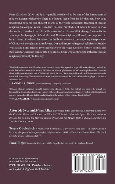 Peter Chaadaev (1794-1856) is rightfully considered to be one of the forerunners of modern Russian philosophy. There is a famous scene from his life that may help us to understand both his own thought as well as the whole subsequent tradition of Russian religious philosophy. When Chaadaev finished his studies of Kant's Critique of Pure Reason, he crossed out the title on the cover and wrote beneath it Apologete adamitischer Vernunft (An Apology for Adamic Reason). Russian religious philosophy was supposed to be a critique of such secular reason. In this book we seek a contemporary interpretation of Chaadaev's thought and its influence. Our authors, including such scholars as Andrzej Walicki and Boris Tarasov, investigate his views on religion, society, history, politics, and Russian fate. Chaadaev turns out to be a crucial figure who continues to influence Russian religious philosophy to this day. ""Nicolas Berdiaev credited Chaadaev with 'the awakening of independent original Russian thought.' Indeed, his main themes have ever since been at the center of Russian philosophy. As a Christian philosopher Chaadaev cherished love of truth over love of fatherland, which, he said, 'feeds national hatreds' and 'sometimes covers the earth with mourning.' This volume is an important contribution to the study of his enduring legacy, for Russia and the world."" --Randall A. Poole, Professor of History, College of St. Scholastica ""Modern Russian religious thought begins with Chaadaev. While his output was small, its impact was far-reaching. Khomiakov, Kireevsky, Herzen, Soloviev, Berdiaev and many others were indebted to Chaadaev in one way or another. He merits the careful attention the authors of this volume devote to him."" --Paul Valliere, Professor Emeritus, Butler University Artur Mrowczy¿ski-Van Allen is Professor at the International Center for the Study of the Christian Orient and Instituto de Filosofia ""Edith Stein,"" Granada, Spain. He is the author of Between the Icon and the Idol: The Human Person and the Modern State in Russian Literature and Thought (Cascade, 2013). Teresa Obolevitch is Professor at the Pontifical University of John Paul II in Krakow, Poland. Recently she published La philosophie religieuse russe (2014) in French and Semen Frank: Shtrikhi k portretu filosofa in Russian (2017). Pawe¿ Rojek is Assistant Lecturer at the Jagiellonian University in Krakow, Poland.