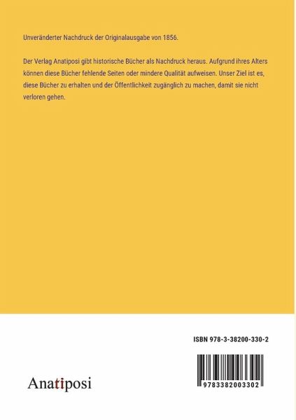 Unveränderter Nachdruck der Originalausgabe von 1856. Der Verlag Anatiposi gibt historische Bücher als Nachdruck heraus. Aufgrund ihres Alters können diese Bücher fehlende Seiten oder mindere Qualität aufweisen. Unser Ziel ist es, diese Bücher zu erhalten und der Öffentlichkeit zugänglich zu machen, damit sie nicht verloren gehen.