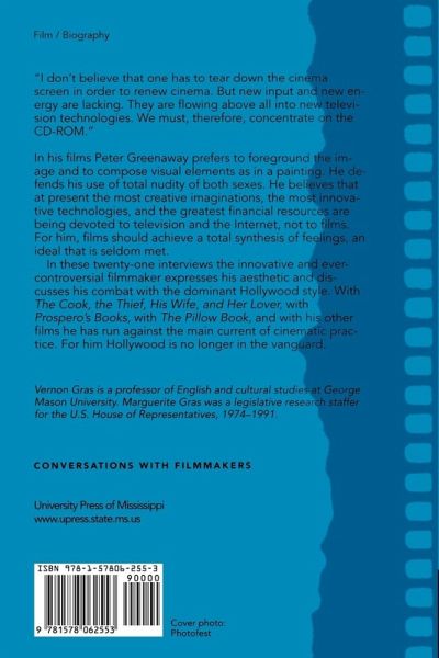 Peter Greenaway: Interviews edited by Vernon Gras and Marguerite Gras In these twenty-one interviews, filmmaker Peter Greenaway expresses his film aesthetic and discusses his combat with the dominant Hollywood style of filmmaking. His films have run unmistakably against the main current of present cinematic practice, from the short film Windows in the mid-seventies, to his more popular but nonetheless challenging films such as A Zed and Two Noughts and The Pillow Book in the nineties. In this collection, the ever-controversial Greenaway discusses his philosophies of film, art, aesthetics, literature, and reality, criticizing and even condemning the standard fare of what he calls Hollywood cinema. For him such films tell stories or they translate literature with its linear narrative onto a medium that he feels should be preeminently visual. He finds that, instead of foregrounding the image and the composition of visual elements as in the long history of painting, Hollywood-style directors seem mesmerized by the "and then and then" narrative. In these provocative interviews Greenaway tells of his ambition to make cinema a medium based more on image than on narrative. He explains his painterly approach in such films as Prospero's Books and The Cook, the Thief, His Wife, and Her Lover, defends his use of total nudity of both sexes, and declares that traditional literary-based cinema is dead. He believes that the most creative imaginations, the most innovative technologies, and the greatest financial resources are being devoted to television and the Internet and that Hollywood moviemaking is no longer in the vanguard. Vernon Gras is a professor of English and cultural studies at George Mason University. Marguerite Gras served as a legislative research staffer at the United States House of Representatives, 1974-1991.