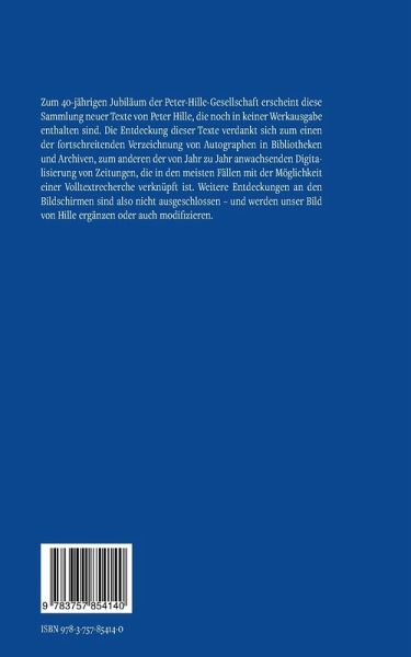 Zum 40-jährigen Jubiläum der Peter-Hille-Gesellschaft erscheint diese Sammlung neuer Texte von Peter Hille, die noch in keiner Werkausgabe enthalten sind. Die Entdeckung dieser Texte verdankt sich zum einen der fortschreitenden Verzeichnung von Autographen in Bibliotheken und Archiven, zum anderen der von Jahr zu Jahr anwachsenden Digitalisierung von Zeitungen, die in den meisten Fällen mit der Möglichkeit einer Volltextrecherche verknüpft ist. Weitere Entdeckungen an den Bildschirmen sind also nicht ausgeschlossen - und werden unser Bild von Hille ergänzen oder auch modifizieren.