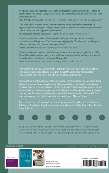 How and why did The Sacred Canopy by Peter L. Berger (1929-2017) become a classic? How have scholars used Berger's ideas over the past 50 years since its publication? How are these ideas relevant to the future of the sociology of religion? Peter L. Berger and the Sociology of Religion explores these questions by providing a broad overview of Berger's work, as well as more focussed studies. The chapters discuss both aspects of Berger's classic text: the 'systematic' sociological theorising on religion and the 'historical' theorising on secularisation. The articles also critically examine Berger's reversal regarding secularisation and the suggested 'desecularisation' of the world. The approaches range from disciplinary history to applications of Berger's ideas. The book includes contributions from Nancy Ammerman, Steve Bruce, David Feltmate, Effie Fokas, Titus Hjelm, D. Paul Johnson, Hubert Knoblauch, Silke Steets, Riyaz Timol, and Bryan S. Turner.