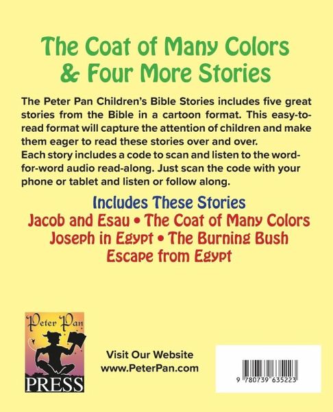 The Peter Pan Children's Bible Stories includes five great stories from the Bible in a cartoon format. This easy-to-read format will capture the attention of children and make them eager to read these stories over and over. Each story includes a code to scan and listen to the word-for-word audio read-along. Just scan the code with your phone or tablet and listen or follow along.