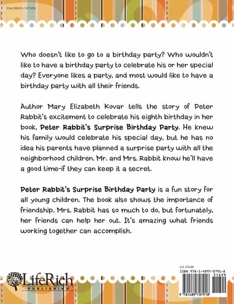 Who doesn't like to go to a birthday party? Who wouldn't like to have a birthday party to celebrate his or her special day? Everyone likes a party, and most would like to have a birthday party with all their friends. Author Mary Elizabeth Kovar tells the story of Peter Rabbit's excitement to celebrate his eighth birthday in her book, Peter Rabbit's Surprise Birthday Party. He knew his family would celebrate his special day, but he has no idea his parents have planned a surprise party with all the neighborhood children. Mr. and Mrs. Rabbit know he'll have a good time-if they can keep it a secret. Peter Rabbit's Surprise Birthday Party is a fun story for all young children. The book also shows the importance of friendship. Mrs. Rabbit has so much to do, but fortunately, her friends can help her out. It's amazing what friends working together can accomplish. Reviewed by Emily-Jane Hills Orford for Readers' Favorite Birthdays can be fun. Especially when they're filled with lots of surprises, games, gifts and cake. And when the birthday includes a surprise party, what could be better! Peter Rabbit is celebrating his birthday. His Mom's busy making a special cake and lots of goodies for a surprise birthday party. She's also busy baking apple pies to send to the new neighbor and welcome them into the neighborhood. Fortunately, two of her friends drop by and pitch in to help. Peter decides to go out to play. When he returns, covered in mud from playing in the pond, his mother tells him to hurry and clean up for his birthday celebrations. Peter doesn't know he's in for a surprise party, but he does know there will be some sort of a celebration complete with gifts and cake. Mary Elizabeth Kovar's picture book story, Peter Rabbit's Surprise Birthday Party, is a simple story that will appeal to young readers. It is full of colorful illustrations with an easy to follow plot leading up to the very special event, the surprise party, and the even bigger surprise at the end, the gift that Peter really wanted for his birthday. And, it's something that he's more than willing to share with all of his friends at the party - a good little note about sharing that always needs reinforcing with young people. Life can't get much better: good family, good friends, good food, and good fun. A sweet story to charm little readers.