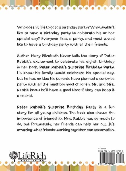 Who doesn't like to go to a birthday party? Who wouldn't like to have a birthday party to celebrate his or her special day? Everyone likes a party, and most would like to have a birthday party with all their friends. Author Mary Elizabeth Kovar tells the story of Peter Rabbit's excitement to celebrate his eighth birthday in her book, Peter Rabbit's Surprise Birthday Party. He knew his family would celebrate his special day, but he has no idea his parents have planned a surprise party with all the neighborhood children. Mr. and Mrs. Rabbit know he'll have a good time—if they can keep it a secret. Peter Rabbit's Surprise Birthday Party is a fun story for all young children. The book also shows the importance of friendship. Mrs. Rabbit has so much to do, but fortunately, her friends can help her out. It's amazing what friends working together can accomplish. Reviewed by Emily-Jane Hills Orford for Readers' Favorite Birthdays can be fun. Especially when they're filled with lots of surprises, games, gifts and cake. And when the birthday includes a surprise party, what could be better! Peter Rabbit is celebrating his birthday. His Mom's busy making a special cake and lots of goodies for a surprise birthday party. She's also busy baking apple pies to send to the new neighbor and welcome them into the neighborhood. Fortunately, two of her friends drop by and pitch in to help. Peter decides to go out to play. When he returns, covered in mud from playing in the pond, his mother tells him to hurry and clean up for his birthday celebrations. Peter doesn't know he's in for a surprise party, but he does know there will be some sort of a celebration complete with gifts and cake. Mary Elizabeth Kovar's picture book story, Peter Rabbit's Surprise Birthday Party, is a simple story that will appeal to young readers. It is full of colorful illustrations with an easy to follow plot leading up to the very special event, the surprise party, and the even bigger surprise at the end, the gift that Peter really wanted for his birthday. And, it's something that he's more than willing to share with all of his friends at the party - a good little note about sharing that always needs reinforcing with young people. Life can't get much better: good family, good friends, good food, and good fun. A sweet story to charm little readers.