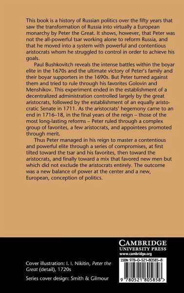 A narrative of the fifty years of political struggles at the Russian court, 1671-1725. This book shows how Peter the Great was not the all-powerful tsar working alone to reform Russia, but that he colluded with powerful and contentious aristocrats in order to achieve his goals. After the early victory of Peter's boyar supporters in the 1690s, Peter turned against them and tried to rule through favourites - an experiment which ended in the establishment of a decentralized 'aristocratic' administration, followed by an equally aristocratic Senate in 1711. The aristocrats' hegemony came to an end in the wake of the affair of Peter's son, Tsarevich Aleksei, in 1718. After that moment Peter ruled through a complex group of favourites, a few aristocrats and appointees promoted through merit, and carried out his most long-lasting reforms. The outcome was a new balance of power at the centre and a new, European, conception of politics.
