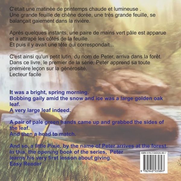 Bilingual / Bilangue English / Français It was a bright, warm spring morning C'était une matinée de printemps chaude et lumineuse. Bobbing gaily in the river was a large golden oak leaf, a very large leaf. Tanguant joyeusement avec le courant naviguait une grande feuille de chêne dorée, une très grande feuille en fait. After some moments, a pair of pale green hands appeared and grabbed the sides of the leaf. Après quelques instants, deux petites mains vert pâle apparurent et attrapèrent les côtés de la feuille. And then there followed a head to match... Suivies aussitôt par une tête assortie. And so, a little Pixie, by the name of Peter arrived at the forest. Et comme ça, un petit lutin, qui s'appelle Lucien, est arrivé dans la forêt. In this, the opening book of the series, Peter learns his very first lesson about giving. Dans ce premier livre de la série, Lucien apprend sa première leçon de générosité. (Free to access Youtube English animation). In addition to being an amusing and interesting story, in itself, these tales also integrate a rich learning system. ¿¿En plus d'être une histoire amusante et intéressante en soi, ces contes intègrent également un riche système d'apprentissage. Firstly, most of the stories incorporate an educational or moral theme or message that can be reflected on with your child. Tout d'abord, la plupart des histoires comportent un thème ou un message éducatif ou moral sur lequel votre enfant peut réfléchir avecvous. Secondly; each story exists in five levels of difficulty; 'I Can Colour', 'I Can Read', 'I Am Reading', 'I Read Alone', and 'Read To Me'. They each contain the same images and the same text, with increasing levels of simplification. Deuxièmement, chaque histoire existe en cinq niveaux de difficulté : "Je sais colorier", "Je sais lire", "Je lis", "Je lis tout seul" et "Lis-moi". Elles contiennent toutes les mêmes images et le même texte, avec des niveaux de simplification croissants. Finally; for each 'I Can Read' language version, there will exist a free-to-access (YouTube) animated video of the story. Enfin, pour chaque version linguistique de "Je sais lire", il existera une video animée de l'histoire en accès libre (YouTube).