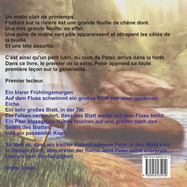 Bilangue/ Zweisprachig Allemand/ Français Deutsch / Französisch Es war ein warmer und heller Frühlingsmorgen. C'était une matinée de printemps chaude et lumineuse. Fröhlich mit dem Strom taumelnd fuhr ein großes goldenes Eichenblatt, ein sehr großes Blatt eigentlich. Tanguant joyeusement avec le courant naviguait une grande feuille de chêne dorée, une très grande feuille en fait. Nach einer Weile erschienen zwei kleine blassgrüne Hände und griffen nach den Seiten des Blattes. Après quelques instants, deux petites mains vert pâle apparurent et attrapèrent les côtés de la feuille. Es folgte sogleich ein passender Kopf. Suivies aussitôt par une tête assortie. Und so kam ein kleiner Kobold, der Peter heißt, in den Wald. Et comme ça, un petit lutin, qui s'appelle Lucien, est arrivé dans la forêt. In diesem ersten Buch der Reihe lernt Lucien seine erste Lektion über das Geben. (Free to access Youtube English animation). Dans ce premier livre de la série, Lucien apprend sa première leçon de générosité. (Free to access Youtube English animation).