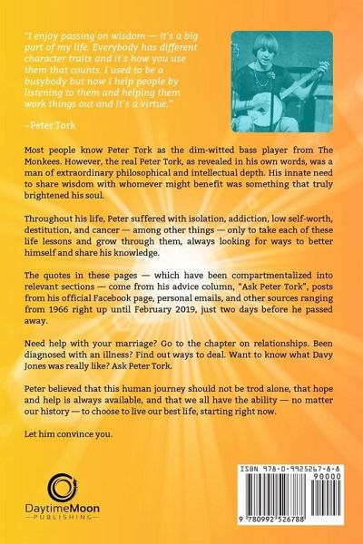 Most people know Peter Tork as the dim-witted bass player from The Monkees. However, the real Peter Tork, as revealed in his own words, was a man of extraordinary philosophical and intellectual depth. His innate need to share wisdom with whomever might benefit was something that truly brightened his soul. Throughout his life, Peter suffered with isolation, addiction, low self-worth, destitution, and cancer - among other things - only to take each of these life lessons and grow through them, always looking for ways to better himself and share his knowledge. The quotes in these pages - which have been compartmentalized into relevant sections - come from his advice column, "Ask Peter Tork", posts from his official Facebook page, personal emails, and other sources ranging from 1966 right up until February 2019, just two days before he passed away. Need help with your marriage? Go to the chapter on relationships. Been diagnosed with an illness? Find out ways to deal. Want to know what Davy Jones was really like? Ask Peter Tork. Peter believed that this human journey should not be trod alone, that hope and help is always available, and that we all have the ability - no matter our history - to choose to live our best life, starting right now. Let him convince you. Contents: Foreword Introduction Tork About Abuse Tork About Addiction Tork About Anxiety Tork About Autobiography Tork About the Blues Tork About Books Tork About Cancer Journey Tork About Childhood Tork About Community-ism Tork About Davy Jones Tork About Death Tork About Despair Tork About Education Tork About Facing Morbidity Tork About Forgiveness Tork About Freedom Tork About Happiness Tork About How to do Life Tork About Inspiring Stuff Tork About Loneliness Tork About Love Tork About Michael Nesmith Tork About Micky Dolenz Tork About Money Tork About The Monkees Tork About Music Tork About Parenthood Tork About Peace Tork About Peter Thorkelson Tork About Prejudice Tork About Politics Tork About Possessions Tork About Purpose Tork About Regret Tork About Relationships Tork About Sex Tork About Self-Worth Tork About the Sixties Tork About Sobriety Tork About Spirituality Tork About Trust Tork About Wisdom Tork About Zen Tork About Zhe End... Acknowledgements References