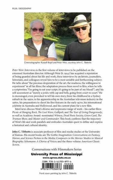 Peter Weir: Interviews is the first volume of interviews to be published on the esteemed Australian director. Although Weir (b. 1944) has acquired a reputation of being guarded about his life and work, these interviews by archivists, journalists, historians, and colleagues reveal him to be a most amiable and forthcoming subject. He talks about "the precious desperation of the art, the madness, the willingness to experiment" in all his films; the adaptation process from novel to film, when he tells a scriptwriter, "I'm going to eat your script; it's going to be part of my blood!"; and his self-assessment as "merely a jester, with cap and bells, going from court to court." He is encouraged, even provoked to tell his own story, from his childhood in a Sydney suburb in the 1950s, to his apprenticeship in the Australian television industry in the 1960s, his preparations to shoot his first features in the early 1970s, his international celebrity in Australia and Hollywood. An extensive new interview details his current plans for a new film. Interviews discuss Weir's diverse and impressive range of work--his earlier films Picnic at Hanging Rock, The Last Wave, Gallipoli, and The Year of Living Dangerously, as well as Academy Award-nominated Witness, Dead Poets Society, Green Card, The Truman Show, and Master and Commander. This book confirms that the trajectory of Weir's life and work parallels and embodies Australia's own quest to define and express a historical and cultural identity. John C. Tibbetts, Lenexa, Kansas, is associate professor of film and media studies at the University of Kansas. His recent books are The Gothic Imagination: Conversations on Fantasy, Horror, and Science Fiction in the Media; Composers in the Movies: Studies in Musical Biography; Schumann: A Chorus of Voices; and the three-volume American Classic Screen.