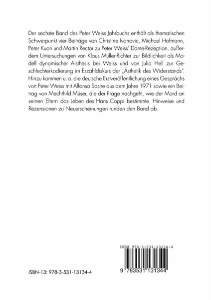 Archiv.- Ein unvergeßliches Gespräch mit Peter Weiss.- Dossier.- Heldenkind. Gespräch mit Hans Coppi über die "Rote Kapelle" und wie der Mord an seinen Eltern sein Leben bestimmte.- Analyse.- "...dieser Portalheilige zur abendländischen Kunst..." Zur Rezeption der Divina Commedia bei Peter Weiss, Pier Paolo Pasolini und anderen.- Der Schritt zur Vernunft. Peter Weiss' Dante-Diskurs als Paradigma einer Dichtung nach Auschwitz.- Peter Weiss' Dante-Rezeption und die poetische Erinnerung der Shoa.- Sechs Thesen zur Dante-Rezeption bei Peter Weiss.- Bilderwelten und Wortwelten: Gegensatz oder Komplement? Peter Weiss' Konzept der Bildlichkeit als Modell dynamischer Aisthesis.- Rosa oder die Sehnsucht nach einer Geschichte ohne Stalin. Zur Logik einer vergeschlechtlichen Textproduktion in der "Ästhetik des Widerstands".- Kritik.- Henning Falkenstein: Peter Weiss.- Friedemann Weidauer: Widerstand und Konformismus.- Karl-Heinz Götze: Poetik des Abgrunds.- Roswitha Schieb: Das teilbare Individuum.- Hinweise.- Mitarbeiterinnen und Mitarbeiter dieses Bandes.