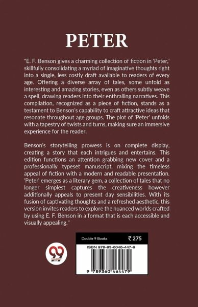 "E. F. Benson gives a charming collection of fiction in 'Peter,' skillfully consolidating a myriad of imaginative thoughts right into a single, less costly draft available to readers of every age. Offering a diverse array of tales, some unfold as interesting and amazing stories, even as others subtly weave a spell, drawing readers into their enthralling narratives. This compilation, recognized as a piece of fiction, stands as a testament to Benson's capability to craft attractive ideas that resonate throughout age groups. The plot of 'Peter' unfolds with a tapestry of twists and turns, making sure an immersive experience for the reader. Benson's storytelling prowess is on complete display, creating a story that each intrigues and entertains. This edition functions an attention grabbing new cover and a professionally typeset manuscript, mixing the timeless appeal of fiction with a modern and readable presentation. 'Peter' emerges as a literary gem, a collection of tales that no longer simplest captures the creativeness however additionally appeals to present day sensibilities. With its fusion of captivating thoughts and a refreshed aesthetic, this version invites readers to explore the nuanced worlds crafted by using E. F. Benson in a format that is each accessible and visually appealing."
