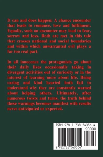 It can and does happen: A chance encounter that leads to romance, love and fulfilment. Equally, such an encounter may lead to fear, sorrow and loss. Both are met in this tale that crosses national and social boundaries and within which unwarranted evil plays a far too real part. In all innocence the protagonists go about their daily lives occasionally taking in divergent activities out of curiosity or in the interest of learning more about life. Being caring and kind hearted both fail to understand why they are constantly warned about helping others. Ultimately, after numerous twists and turns, the truth behind these warnings becomes manifest with results never anticipated or expected.