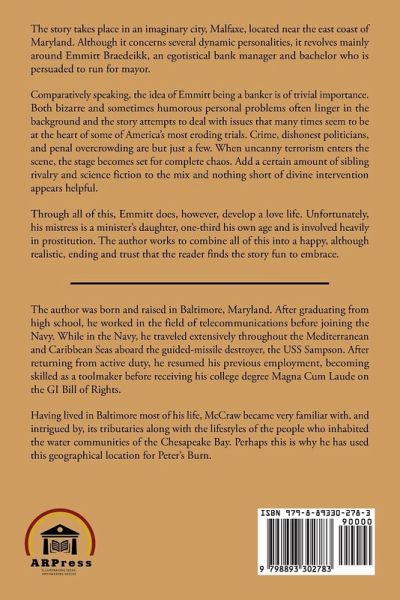 The author was born and raised in Baltimore, Maryland. After graduating from high school, he worked in the field of telecommunications before joining the Navy. While in the Navy, he traveled extensively throughout the Mediterranean and Caribbean Seas aboard the guided-missile destroyer, the USS Sampson. After returning from active duty, he resumed his previous employment, becoming skilled as a toolmaker before receiving his college degree Magna Cum Laude on the GI Bill of Rights.Having lived in Baltimore most of his life, McCraw became very familiar with, and intrigued by, its tributaries along with the lifestyles of the people who inhabited the water communities of the Chesapeake Bay. Perhaps this is why he has used this geographical location for Peter's Burn.