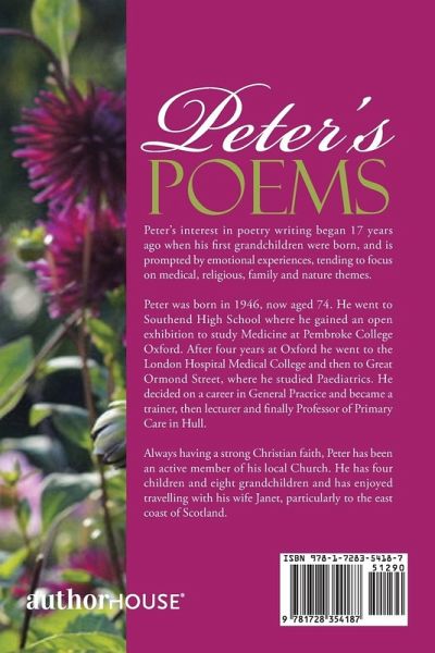 Peter's interest in poetry writing began 17 years ago when his first grandchildren were born, and is prompted by emotional experiences, tending to focus on medical, religious, family and nature themes. Peter was born in 1946, now aged 74. He went to Southend High School where he gained an open exhibition to study Medicine at Pembroke College Oxford. After four years at Oxford he went to the London Hospital Medical College and then to Great Ormond Street, where he studied Paediatrics. He decided on a career in General Practice and became a trainer, then lecturer and finally Professor of Primary Care in Hull. Always having a strong Christian faith, Peter has been an active member of his local Church. He has four children and eight grandchildren and has enjoyed travelling with his wife Janet, particularly to the east coast of Scotland.