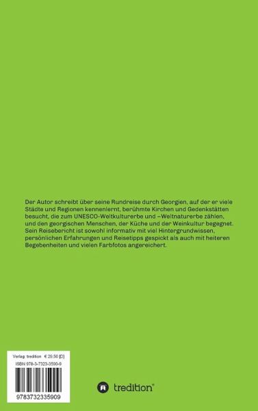 Der Autor schreibt über seine Rundreise durch Georgien, auf der er viele Städte und Regionen kennenlernt, berühmte Kirchen und Gedenkstätten besucht, die zum UNESCO-Weltkulturerbe und -Weltnaturerbe zählen, und den georgischen Menschen, der Küche und der Weinkultur begegnet. Sein Reisebericht ist sowohl informativ mit viel Hintergrundwissen, persönlichen Erfahrungen und Reisetipps gespickt als auch mit heiteren Begebenheiten und vielen Farbfotos angereichert.