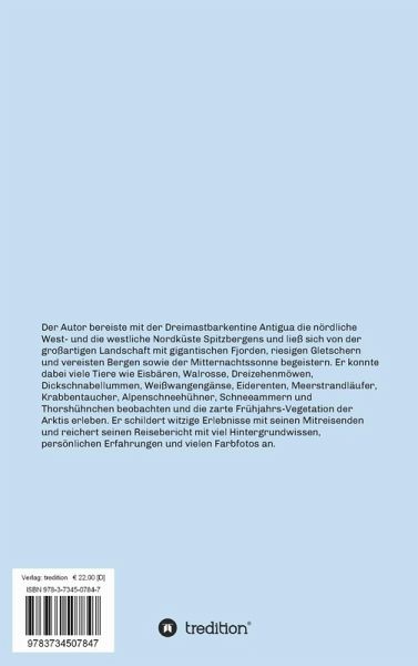 Der Autor bereiste mit der Dreimastbarkentine Antigua die nördliche West- und die westliche Nordküste Spitzbergens und ließ sich von der großartigen Landschaft mit gigantischen Fjorden, riesigen Gletschern und vereisten Bergen sowie der Mitternachtssonne begeistern. Er konnte dabei viele Tiere wie Eisbären, Walrosse, Dreizehenmöwen, Dickschnabellummen, Weißwangengänse, Eiderenten, Meerstrandläufer, Krabbentaucher, Alpenschneehühner, Schneeammern und Thorshühnchen beobachten und die zarte Frühjahrs-Vegetation der Arktis erleben. Er schildert witzige Erlebnisse mit seinen Mitreisenden und reichert seinen Reisebericht mit viel Hintergrundwissen, persönlichen Erfahrungen und vielen Farbfotos an.