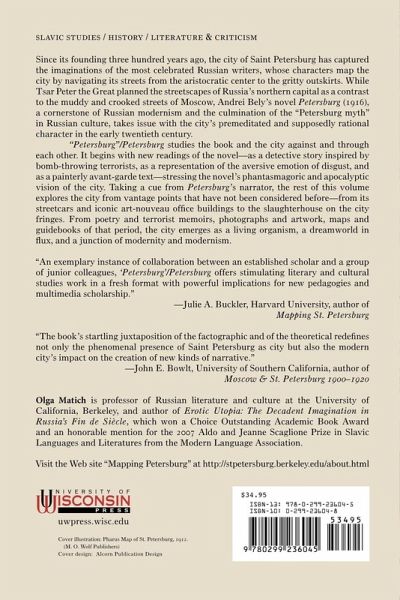 Since its founding three hundred years ago, the city of Saint Petersburg has captured the imaginations of the most celebrated Russian writers, whose characters map the city by navigating its streets from the aristocratic center to the gritty outskirts. While Tsar Peter the Great planned the streetscapes of Russia's northern capital as a contrast to the muddy and crooked streets of Moscow, Andrei Bely's novel Petersburg (1916), a cornerstone of Russian modernism and the culmination of the 'Petersburg myth' in Russian culture, takes issue with the city's premeditated and supposedly rational character in the early twentieth century. 'Petersburg'/Petersburg studies the book and the city against and through each other. It begins with new readings of the novel - as a detective story inspired by bomb-throwing terrorists, as a representation of the aversive emotion of disgust, and as a painterly avant-garde text - stressing the novel's phantasmagoric and apocalyptic vision of the city. Taking a cue from Petersburg's narrator, the rest of this volume (and the companion Web site, stpetersburg.berkeley.edu/) explores the city from vantage points that have not been considered before - from its streetcars and iconic art-nouveau office buildings to the slaughterhouse on the city fringes. From poetry and terrorist memoirs, photographs and artwork, maps and guidebooks of that period, the city emerges as a living organism, a dreamworld in flux, and a junction of modernity and modernism.
