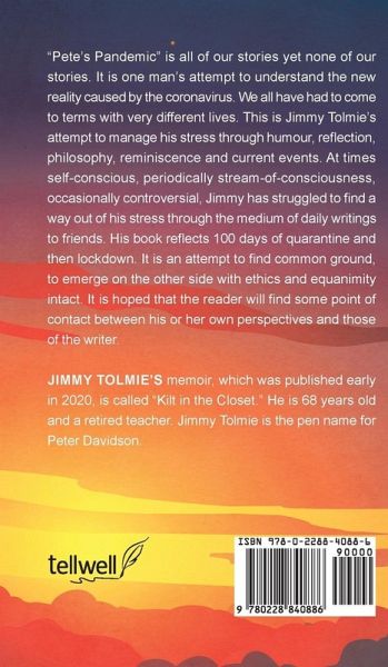 "Pete's Pandemic" is all of our stories yet none of our stories. It is one man's attempt to understand the new reality caused by the coronavirus. We all have had to come to terms with very different lives. This is Jimmy Tolmie's attempt to manage his stress through humour, reflection, philosophy, reminiscence and current events. At times self-conscious, periodically stream-of-consciousness, occasionally controversial, Jimmy has struggled to find a way out of his stress through the medium of daily writings to friends. His book reflects 100 days of quarantine and then lockdown. It is an attempt to find common ground, to emerge on the other side with ethics and equanimity intact. It is hoped that the reader will find some point of contact between his or her own perspectives and those of the writer.