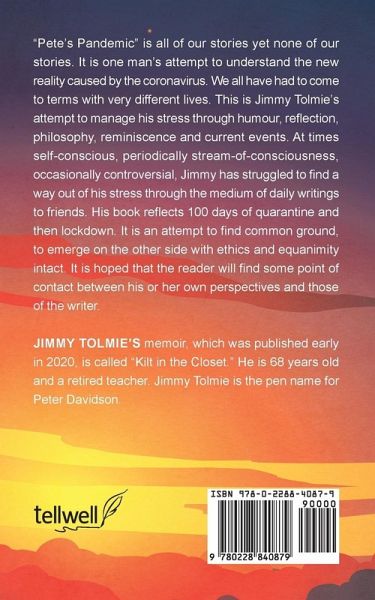 "Pete's Pandemic" is all of our stories yet none of our stories. It is one man's attempt to understand the new reality caused by the coronavirus. We all have had to come to terms with very different lives. This is Jimmy Tolmie's attempt to manage his stress through humour, reflection, philosophy, reminiscence and current events. At times self-conscious, periodically stream-of-consciousness, occasionally controversial, Jimmy has struggled to find a way out of his stress through the medium of daily writings to friends. His book reflects 100 days of quarantine and then lockdown. It is an attempt to find common ground, to emerge on the other side with ethics and equanimity intact. It is hoped that the reader will find some point of contact between his or her own perspectives and those of the writer.