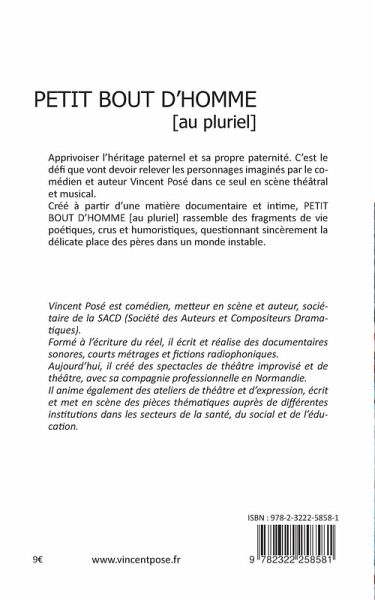 Apprivoiser l'héritage paternel et sa propre paternité. C'est le défi que vont devoir relever les personnages imaginés par le comédien et auteur Vincent Posé dans ce seul en scène théâtral et musical.Créé à partir d'une matière documentaire et intime, Petit Bout d'Homme [au pluriel] rassemble des fragments de vie poétiques, crus, humoristiques, questionnant sincèrement la délicate place des pères dans un monde instable.