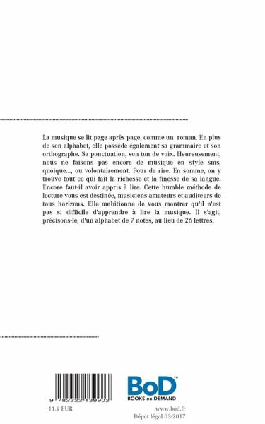 La musique se lit page après page, comme un roman. En plus de son alphabet, elle possède également sa grammaire et son orthographe. Sa ponctuation, son ton de voix. Heureusement, nous ne faisons pas encore de musique en style sms, quoique..., ou volontairement. Pour de rire. En somme, on y trouve tout ce qui fait la richesse et la finesse de sa langue...Encore faut-il avoir appris à lire.Cette humble méthode de lecture vous est destinée, musiciens amateurs et auditeurs de tous horizons. Elle ambitionne de vous montrer qu'il n'est pas si difficile d'apprendre à lire la musique. Il s'agit, précisons-le, d'un alphabet de 7 notes, au lieu de 26 lettres.