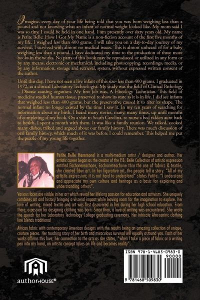 Imagine, every day of your life being told that you was born weighing less than a pound and not knowing what an infant of normal weight looked like. My mom said I was so tiny, I could be held in one hand. I am presently over sixty years old. My name is Petite Belle: How I Got My Name is a non-fiction account of the first five months of my life. I weighed less than 400 grams. I will take you on a day-to-day journey of my survival. I survived with almost no medical issues. This is almost unheard of for a baby weighing less than a pound. I have dedicated my time to the production of three more books in the works. No parts of this book may be reproduced or utilized in any form or by any means, electronic or mechanical, including photocopying, recordings, media, or by any information, storage and retrieval, system, without expressed written consent of the author. Until this day, I have not seen a live infant of this size- less than 400 grams. I graduated in 1972, as a clinical Laboratory Technologist. My study was the field of Clinical Pathology - Disease causing organism. My first job was, A Histology Technician. This field of medicine studied human tissue, preserved to show its state as it is in life. I did see infants that weighed less than 400 grams, but the preservative caused it to alter its shape. The normal infant no longer existed by the time I saw it. In my ten years of searching for information about my birth, I heard many stories, many, many times, up until months of completing of my book. On a visit to South Carolina, to nurse a bed ridden aunt back to health, I spent a month with them. It was like a family reunion. We talked, cooked many dishes, talked and argued about our family history. There was much discussion of oral family history, which much of it was before I could remember. This helped me put the puzzle of my young life together.
