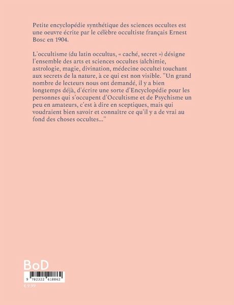 Petite encyclopédie synthétique des sciences occultes est une oeuvre écrite par le célèbre occultiste français Ernest Bosc en 1904.L'occultisme (du latin occultus, « caché, secret ») désigne l'ensemble des arts et sciences occultes (alchimie, astrologie, magie, divination, médecine occulte) touchant aux secrets de la nature, à ce qui est non visible. "Un grand nombre de lecteurs nous ont demandé, il y a bien longtemps déjà, d'écrire une sorte d'Encyclopédie pour les personnes qui s'occupent d'Occultisme et de Psychisme un peu en amateurs, c'est à dire en sceptiques, mais qui voudraient bien savoir et connaître ce qu'il y a de vrai au fond des choses occultes..."