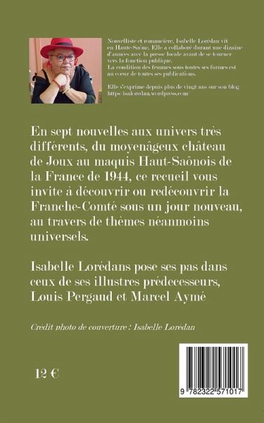 En sept nouvelles aux univers très différents, du moyenâgeux château de Joux au maquis Haut-Saônois de la France de 1944, ce recuei vous invite à découvrir ou redécouvrir la Franche-Comté sous un jour nouveau, au travers de thèmes néanmoins universels. Isabelle Lorédan pose ses pas dans ceux de ses illustres prédecesseurs, Louis Pergaud et Marcel Aymé.