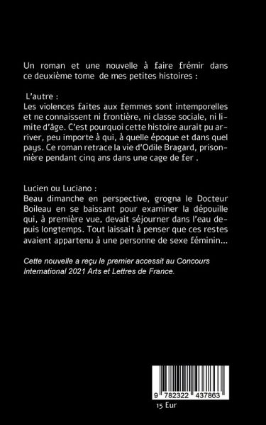 Un roman et une nouvelle à faire frémir dans ce deuxième tome de mes petites histoires."l'autre" : les violences faites aux femmes sont intemporelles et ne connaissent ni frontière, ni classe sociale, ni limite d'âge. C'est pourquoi cette histoire aurait pu arriver, peu importe à qui d'autre qu'à Odile Bragard, à quelle époque et dans quel pays. Prisonnière pendant cinq longues années dans une cage de fer, Odile Bragard nous conte ici les événements qui ont bouleversé son existence."Lucien ou Luciano" a reçu le premier accessit section nouvelles au Concours International 2021 Arts et Lettres de France :"Beau dimanche en perspective", grogna le Docteur Boileau en se baissant pour examiner la dépouille qui, à première vue, avait dû séjourner longtemps dans l'eau. Tous laissait à penser que ces pauvres restes avaient appartenu à une personne de sexe féminin...
