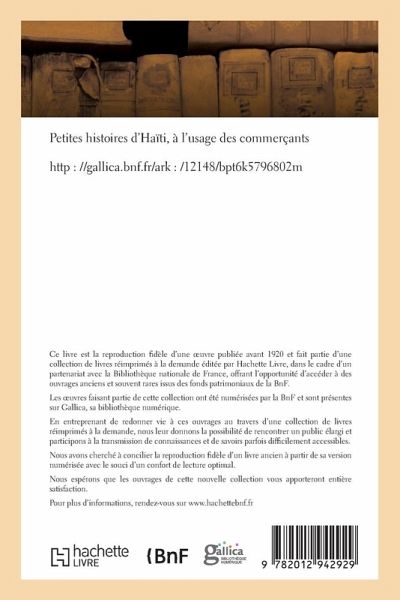 Petites histoires d'Haïti, à l'usage des commerçants Date de l'édition originale: 1895 Le présent ouvrage s'inscrit dans une politique de conservation patrimoniale des ouvrages de la littérature Française mise en place avec la BNF. HACHETTE LIVRE et la BNF proposent ainsi un catalogue de titres indisponibles, la BNF ayant numérisé ces oeuvres et HACHETTE LIVRE les imprimant à la demande. Certains de ces ouvrages reflètent des courants de pensée caractéristiques de leur époque, mais qui seraient aujourd'hui jugés condamnables. Ils n'en appartiennent pas moins à l'histoire des idées en France et sont susceptibles de présenter un intérêt scientifique ou historique. Le sens de notre démarche éditoriale consiste ainsi à permettre l'accès à ces oeuvres sans pour autant que nous en cautionnions en aucune façon le contenu. Pour plus d'informations, rendez-vous sur www.hachettebnf.fr