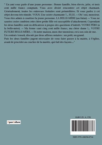 "Petites misères de la vie conjugale" est une uvre d'Honoré de Balzac qui explore avec une ironie mordante les complexités et les désillusions du mariage. Divisé en deux parties, le livre commence par une préface où Balzac promet que chaque lecteur y retrouvera ses propres impressions de mariage. La première partie aborde divers aspects de la vie conjugale, tels que les découvertes surprenantes après le mariage, les petites attentions et taquineries d'une jeune épouse, et la logique souvent déroutante des femmes. Balzac décrit également les souvenirs et regrets qui jalonnent la vie à deux, ainsi que les "travaux forcés" que représentent certaines obligations conjugales. La deuxième partie continue d'explorer les défis du mariage, en se concentrant sur les attentes déçues, les souffrances silencieuses, et les indiscrétions qui peuvent miner la relation. Balzac n'hésite pas à aborder les révélations brutales et les querelles inévitables, tout en soulignant l'art d'être une victime dans le couple. À travers une série de vignettes et d'observations, l'auteur dresse un tableau à la fois comique et tragique de la vie conjugale, révélant les petites misères qui, cumulées, peuvent peser lourdement sur le bonheur conjugal.