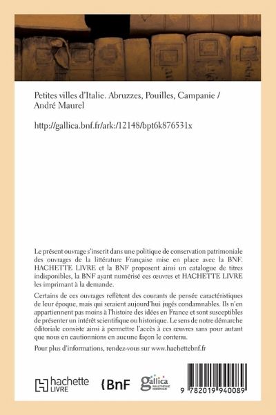 Petites villes d'Italie. Abruzzes, Pouilles, Campanie / André Maurel Date de l'édition originale: 1909-1920 Collection: Bibliothèque de géographie et des voyages Le présent ouvrage s'inscrit dans une politique de conservation patrimoniale des ouvrages de la littérature Française mise en place avec la BNF. HACHETTE LIVRE et la BNF proposent ainsi un catalogue de titres indisponibles, la BNF ayant numérisé ces oeuvres et HACHETTE LIVRE les imprimant à la demande. Certains de ces ouvrages reflètent des courants de pensée caractéristiques de leur époque, mais qui seraient aujourd'hui jugés condamnables. Ils n'en appartiennent pas moins à l'histoire des idées en France et sont susceptibles de présenter un intérêt scientifique ou historique. Le sens de notre démarche éditoriale consiste ainsi à permettre l'accès à ces oeuvres sans pour autant que nous en cautionnions en aucune façon le contenu. Pour plus d'informations, rendez-vous sur www.hachettebnf.fr