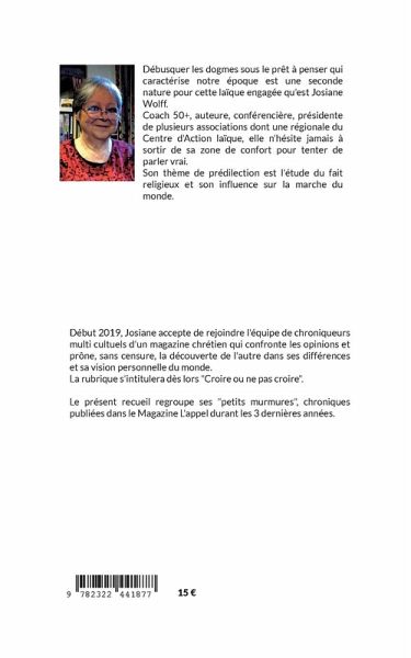Début 2019, l'auteure, laïque engagée, accepte de rejoindre l'équipe de chroniqueurs multi cultuels d'un magazine chrétien qui confronte les opinions et prône, sans censure, la découverte de l'autre dans ses différences et sa vision personnelle du monde. La rubrique s'intitulera dès lors "Croire ou ne pas croire".Ce recueil regroupe les petits murmures laïques de Josiane Wolff, publiés dans le Magazine L'appel durant les 3 dernières années.
